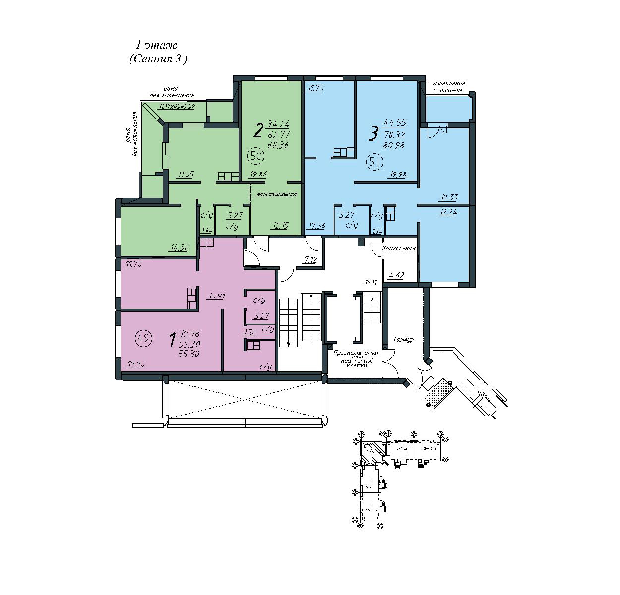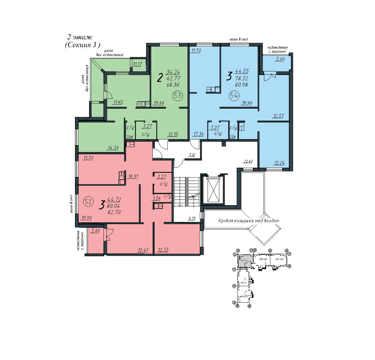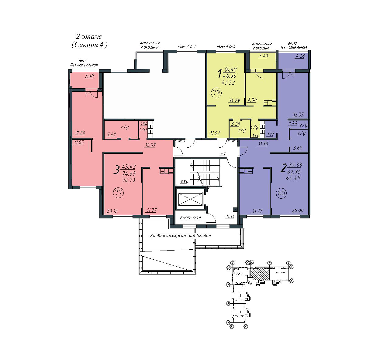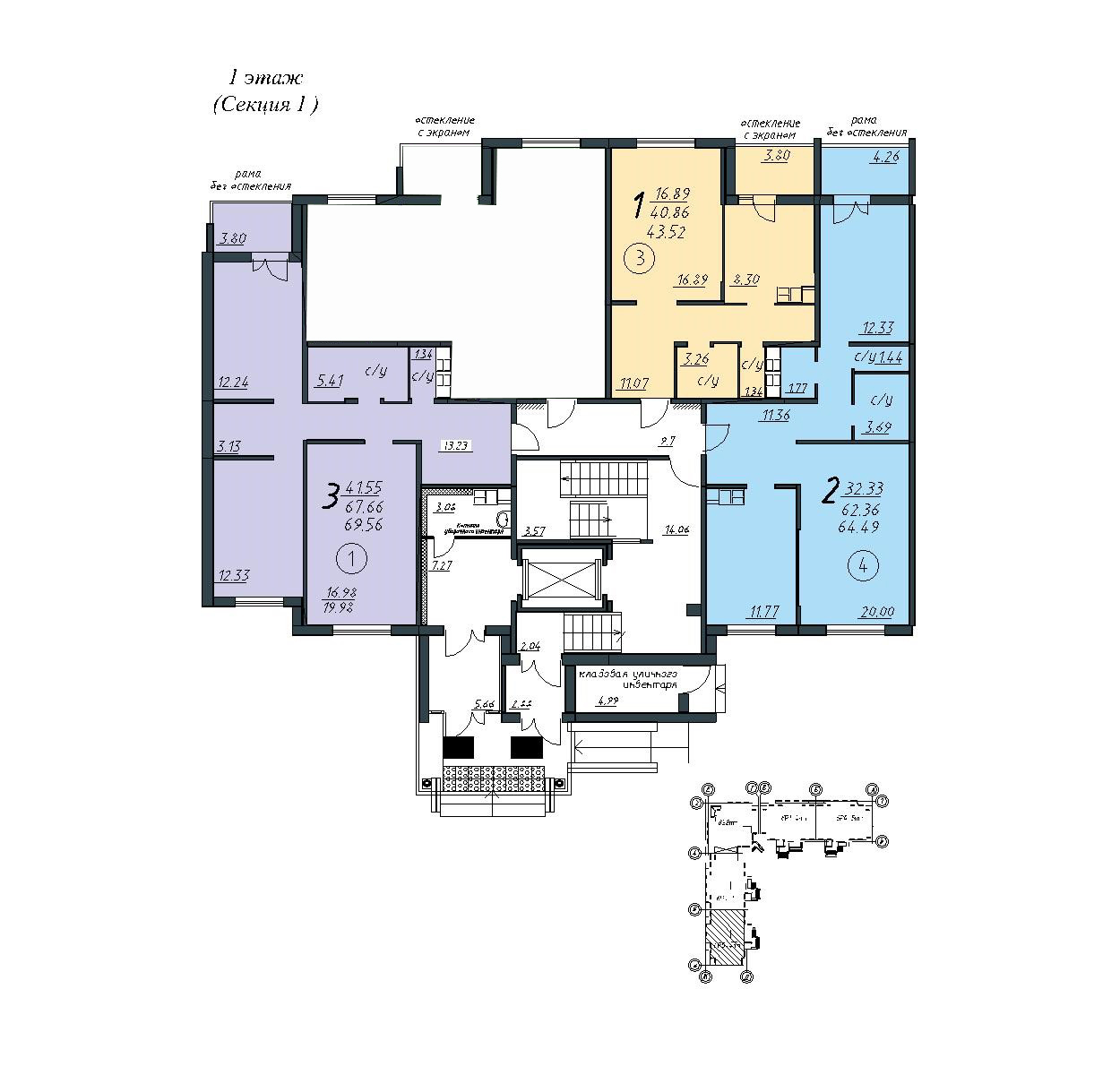 1-но (43,52 – 55,3 м2); 2- х (52,44-56,29) м2; 2-х (64,49-68,36) м2; 3-х (64,53-69,56) м2 комн. кв. |