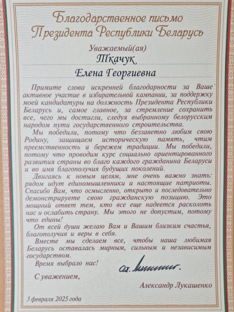 За активное участие в избирательной кампании, за стремление сохранить всё то, чего достиг белорусский народ, следуя выбранному белорусским народом пути государственного строительства, заместитель генерального директора ОАО "Гродножилстрой" Полхович Геннадий Николаевич вручил ведущему инженеру ПТО Ткачук Елене Георгиевне Благодарственное письмо Президента Республики Беларусь. Это замечательное событие подчеркивает значимость вклада каждого человека в общественные процессы.
