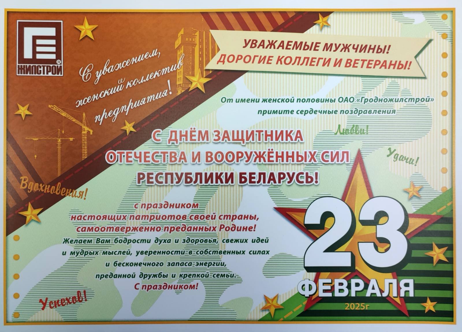 От имени женской половины ОАО «Гродножилстрой» примите сердечные поздравления с Днём защитников Отечества и Вооружённых Сил Республики Беларусь – с праздником настоящих патриотов своей страны, самоотверженно преданных Родине!