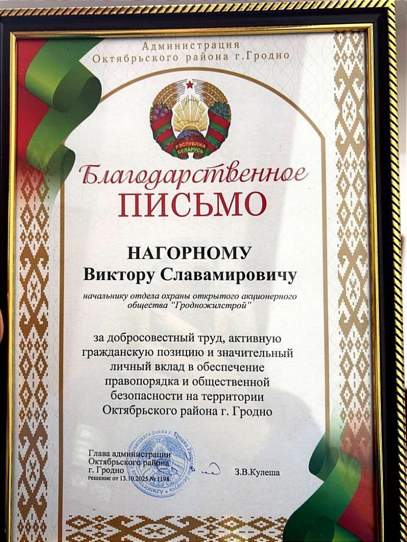 Также за добросовестный труд, активную гражданскую позицию и значительный личный вклад в обеспечение правопорядка и общественной безопасности на территории Октябрьского района г. Гродно два работника ОАО "Гродножилстрой" отмечены Главой администрации Октябрьского района г. Гродно благодарственными письмами.