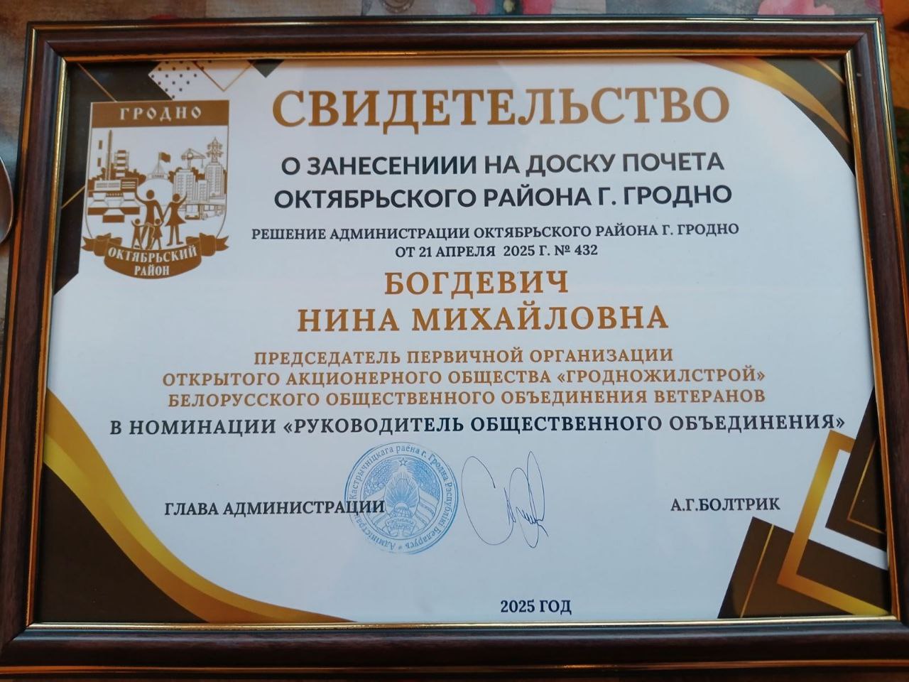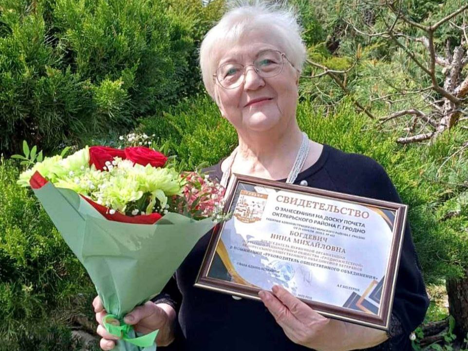 Поздравляем председателя ветеранского движения ОАО "Гродножилстрой" Нину Михайловну БОГДЕВИЧ с занесением на доску Почёта Октябрьского района г.Гродно в номинации "Руководитель общественного объединения".